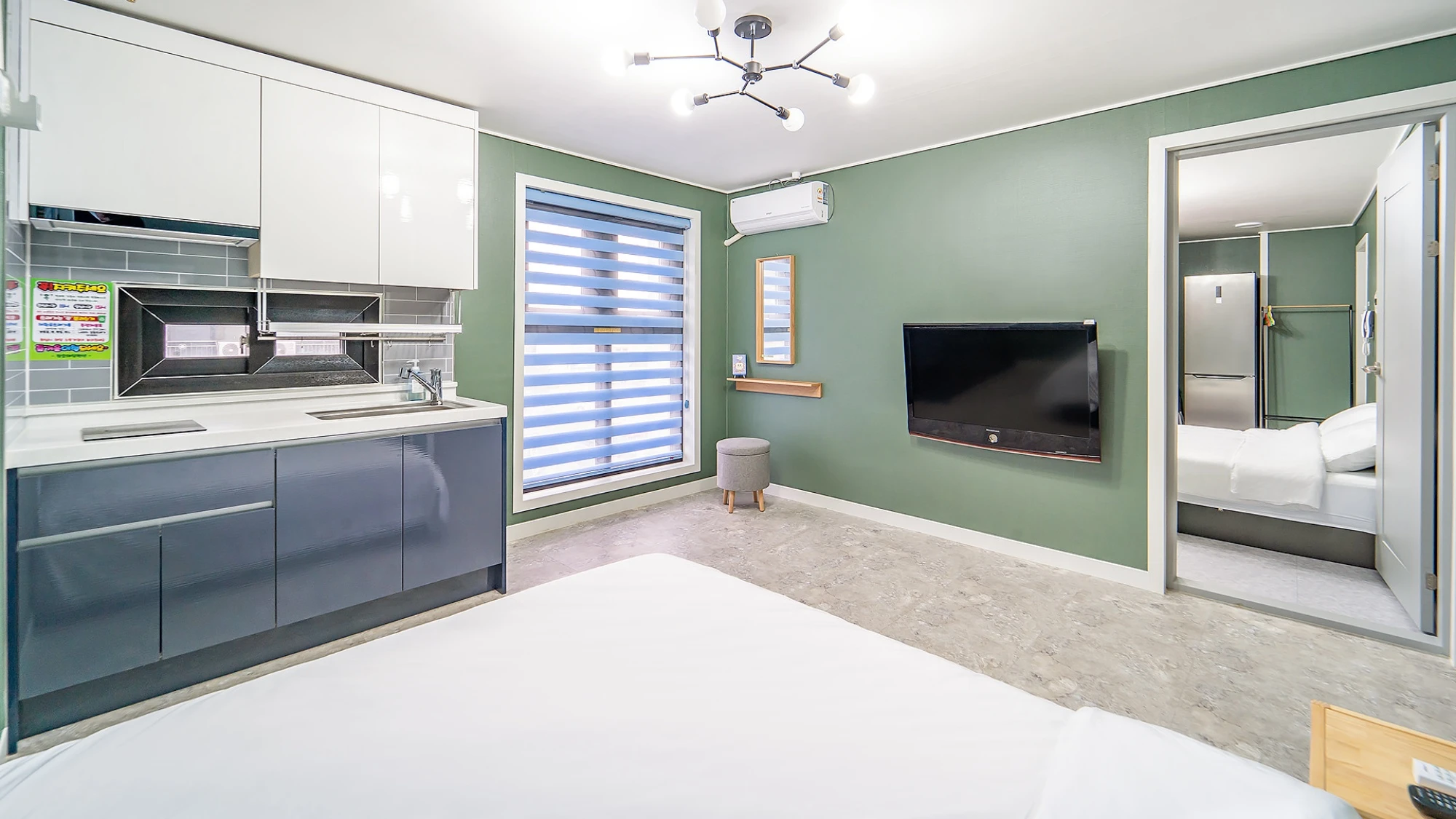 - 집기품목 : TV, 에어컨, 냉장고, 인덕션, 전기밥솥, 취사시설/도구, 드라이기, 샴푸, 바디워시, 비누, 치약, 타월, 와이파이, 금연, 무선인터넷, 욕실용품